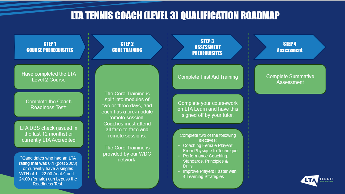 Please find the roadmap diagram for gaining an LTA Tennis Coach (Level 3) qualification below.